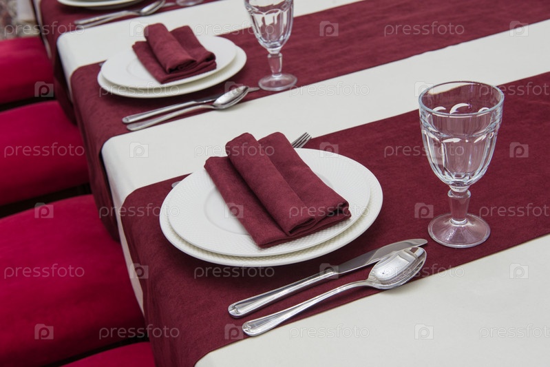 Сервировка банкетного стола в роскошном ресторане в красно-белом стиле