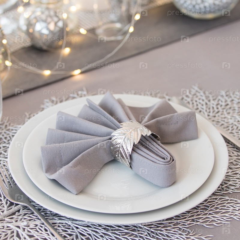 Красивая сервировка стола с новогодними украшениями. Серебряные цвета