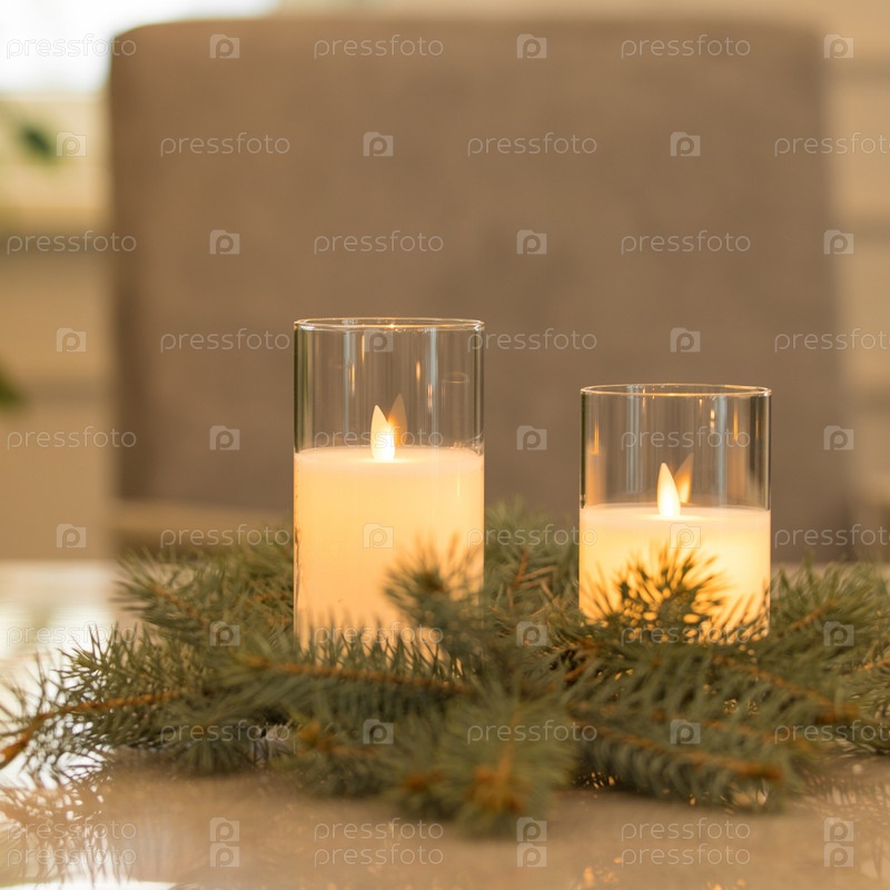 Красивые рождественские украшения. Свечи и еловая ветка