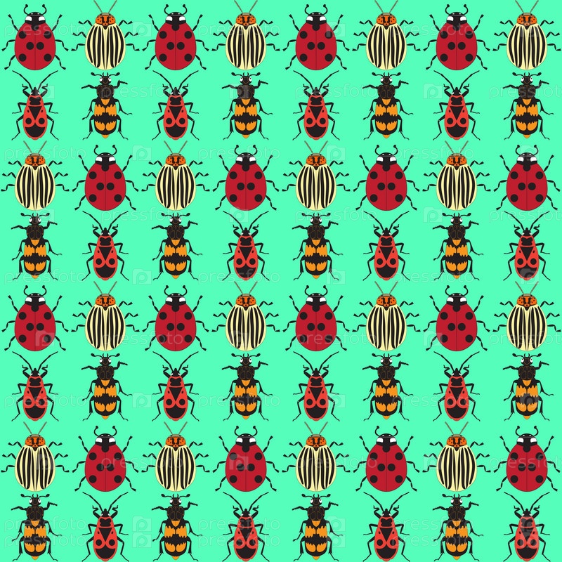 Бесшовная текстура с изображением насекомых: божья коровка, клоп, колорадский жук, жук-могильщик