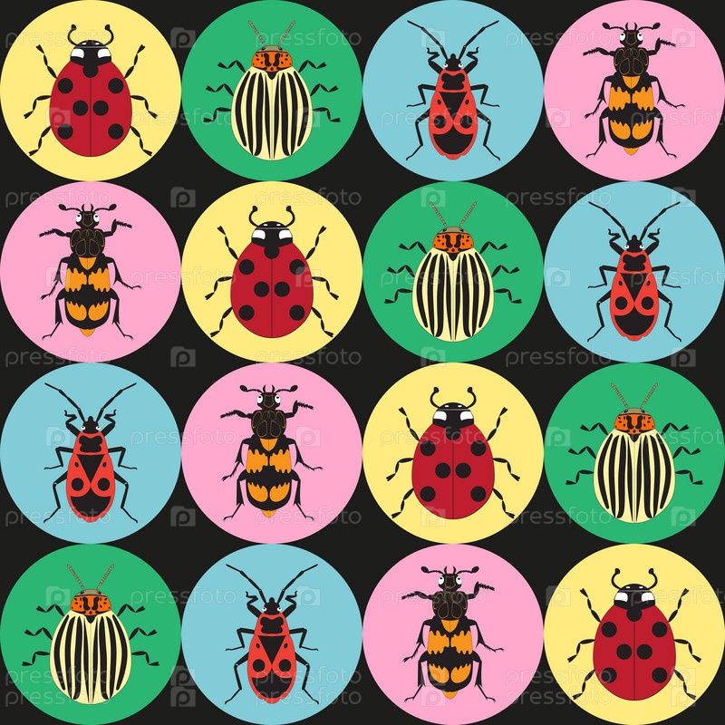 Бесшовная текстура с изображением насекомых: божья коровка, клоп, колорадский жук, жук-могильщик
