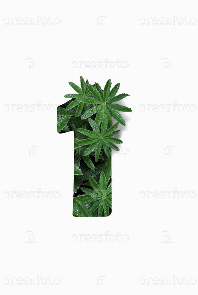 Арабская цифра один 1, выделенная на белом фоне. Стилизован под коллаж из фотографии листа цветка люпина