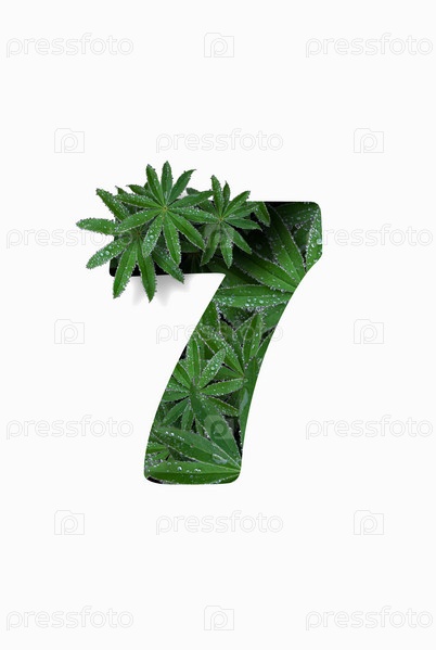 Арабская цифра семь 7, выделенная на белом фоне. Стилизован под коллаж из фотографии листа цветка люпина