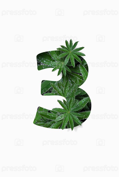 Арабская цифра три 3, выделенная на белом фоне. Стилизован под коллаж из фотографии листа цветка люпина