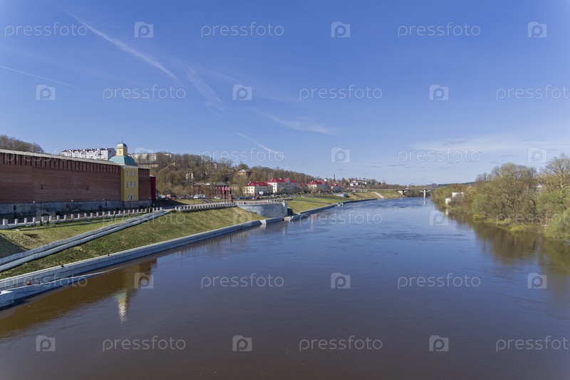 Набережная Днепра в центре Смоленска, частично затопленная паводком. Конец апреля, солнечный день