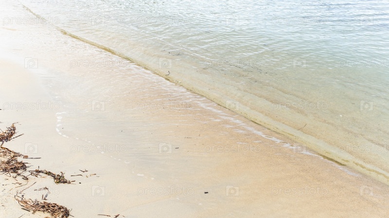 Синий фон морской волны на песчаном пляже с водорослями