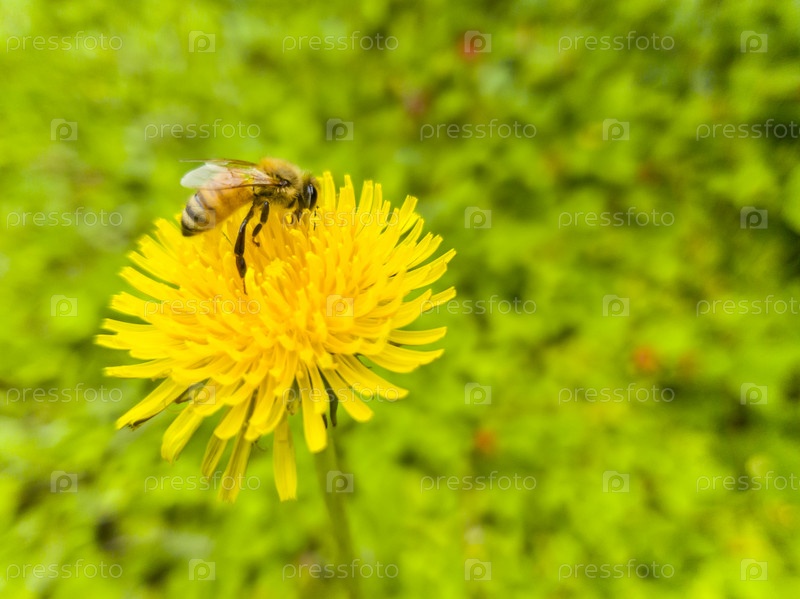 Желтый одуванчик и пчела на летнем лугу