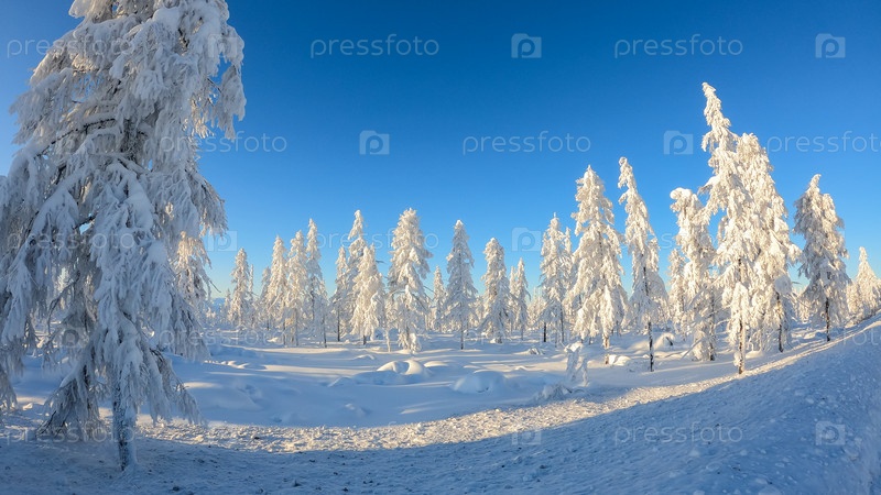 Зимний лес, заснеженные ели на склоне горы, Колыма, Россия