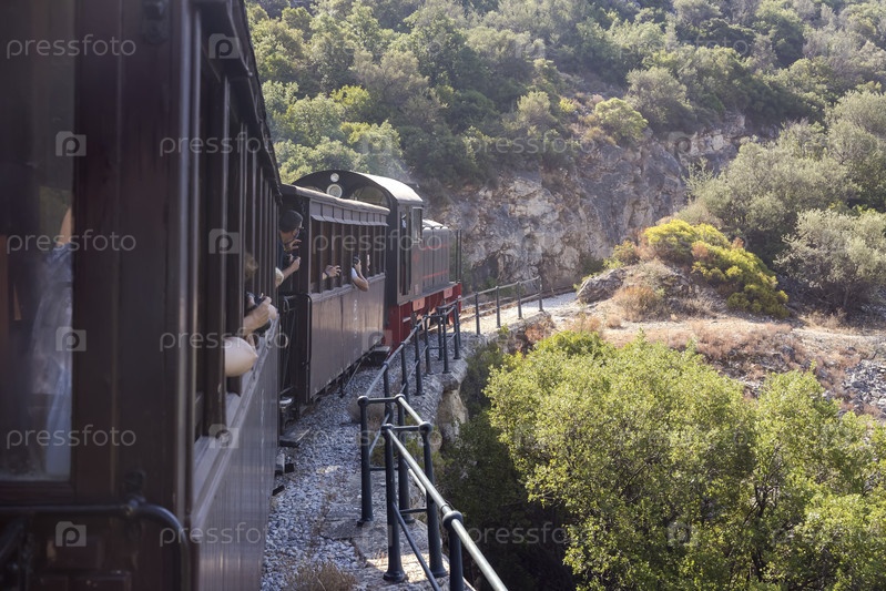 Знаменитый поезд Пелиона прокладывает свой маршрут в горах (Греция)