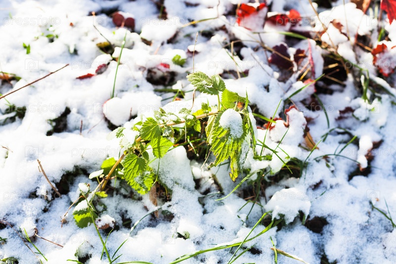 Зеленая веточка на лужайке, покрытой первым снегом