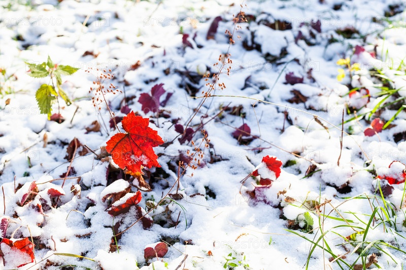 Красные листья на лужайке, покрытой первым снегом