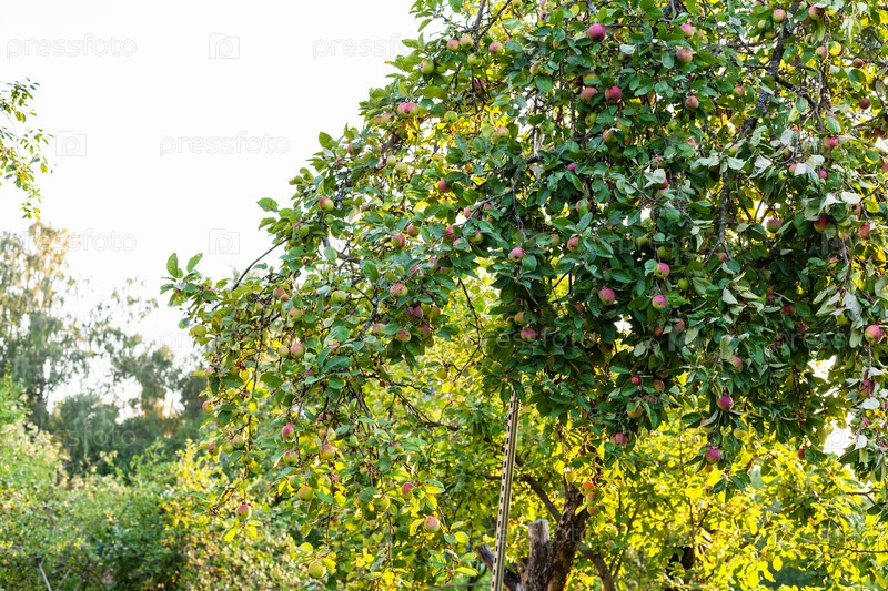 Старая яблоня со спелыми яблоками на закате лета