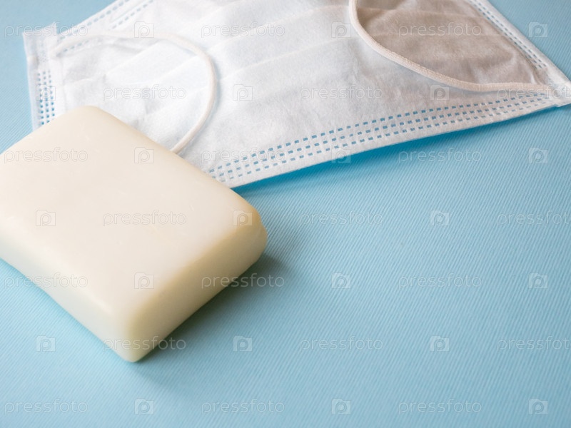 Крупным планом изображение медицинской маски с мылом на синем фоне. Концепция медицины