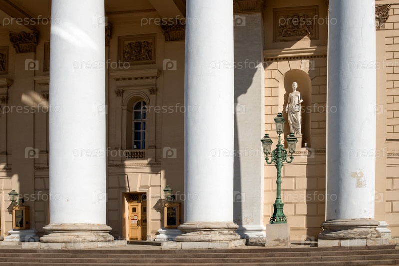 Москва, Россия - 10 мая 2021 года: Детали оформления фасада Большого театра. Архитектура и достопримечательность Москвы, дневной городской пейзаж Москвы. В историческом центре Москвы