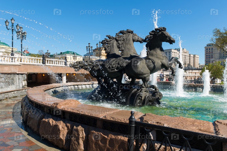 Москва, Россия - 10 мая 2021 года: Фонтан "Четыре сезона" был основан в 1996 году. Архитектура и достопримечательность Москвы, дневной городской пейзаж Москвы. Большой фонтан на Манежной площади в историческом центре Москвы