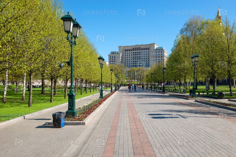 Вид на Александровский сад — парк в Тверском районе Москвы, расположенный вдоль западной кремлевской стены, протянувшийся от площади Революции до Кремлевской набережной. Основан в 1812 г