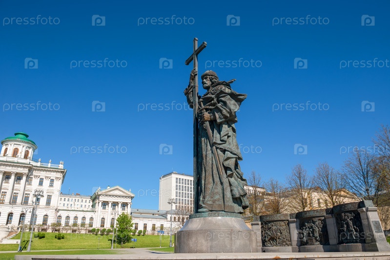 Москва, Россия - 10 мая 2021 года: Памятник Святому равноапостольному князю Владимиру Святославичу, Крестителю Руси, установлен на Манежной улице, напротив Дома Пашкова