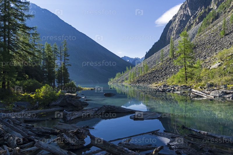 Большое (нижнее) Шавлинское озеро. Раннее солнечное утро. Горный Алтай. Август