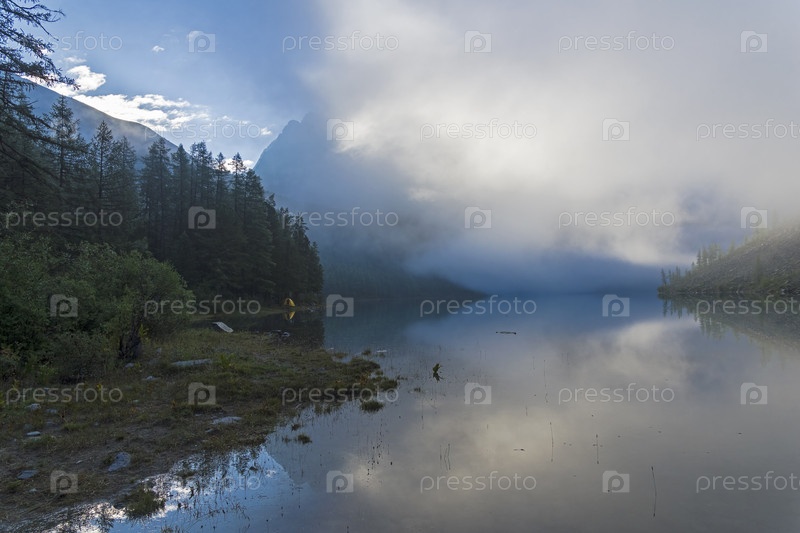 Облака лежат на поверхности озера. Туманное летнее утро. Большое (нижнее) Шавлинское озеро. Горный Алтай. Август