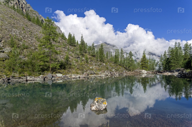 Отражение берега озера в водной глади. Большое (нижнее) Шавлинское озеро. Горный Алтай. Август