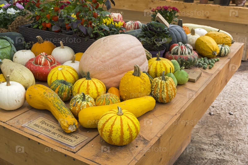 Разнообразные тыквы и кабачки на традиционной осенней выставке плодов и овощей в Аптекарском Огороде (филиал ботанического сада МГУ). Москва