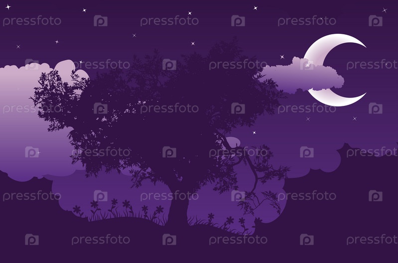 Ночной пейзаж с силуэтом дерева