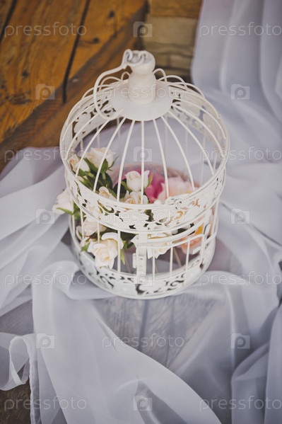 Клетка для птиц, украшенная цветами и тканью