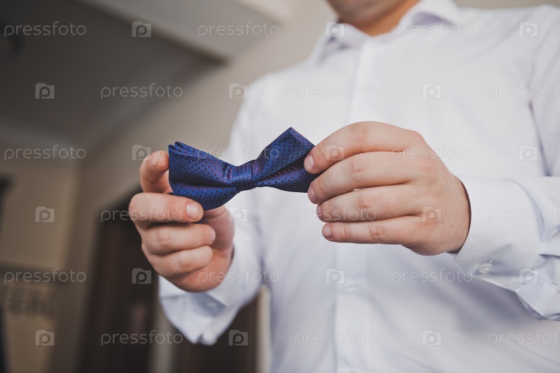 Мужчина в белой рубашке держит галстук-бабочку