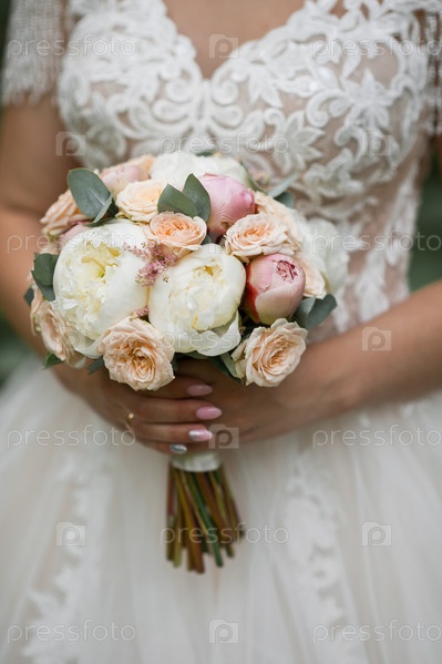 Свадебный нежный букет пионов и бутонов в руках невесты