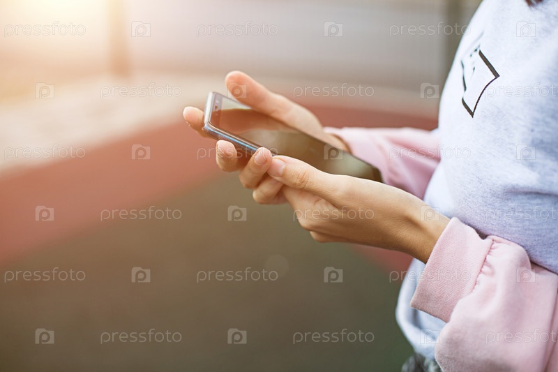Смартфон в женских руках крупным планом. Используя телефон, пальцы на сенсорном экране гаджета. Текстовые сообщения, ведение бизнеса, интернет-приложения. Место для текста