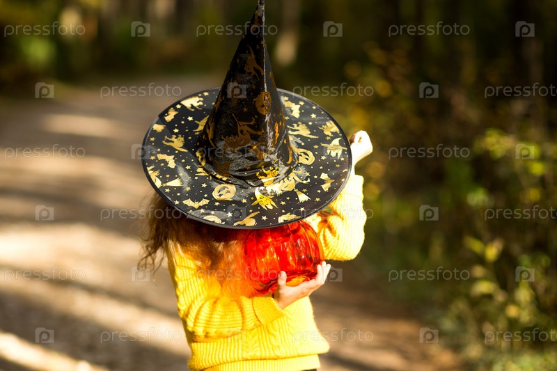 Девушка в ведьминской шапке, в желтом свитере и с тыквой, фонарем и ведром для сладостей в осеннем лесу. Праздник Хэллоуина. Портрет, крупный план