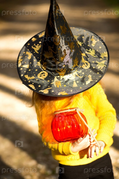 Девушка в ведьминской шапке, в желтом свитере и с тыквой, фонарем и ведром для сладостей в осеннем лесу. Праздник Хэллоуина. Портрет, крупный план