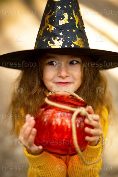 Девушка в ведьминской шапке, в желтом свитере и с тыквой, фонарем и ведром для сладостей в осеннем лесу. Праздник Хэллоуина. Портрет, крупный план