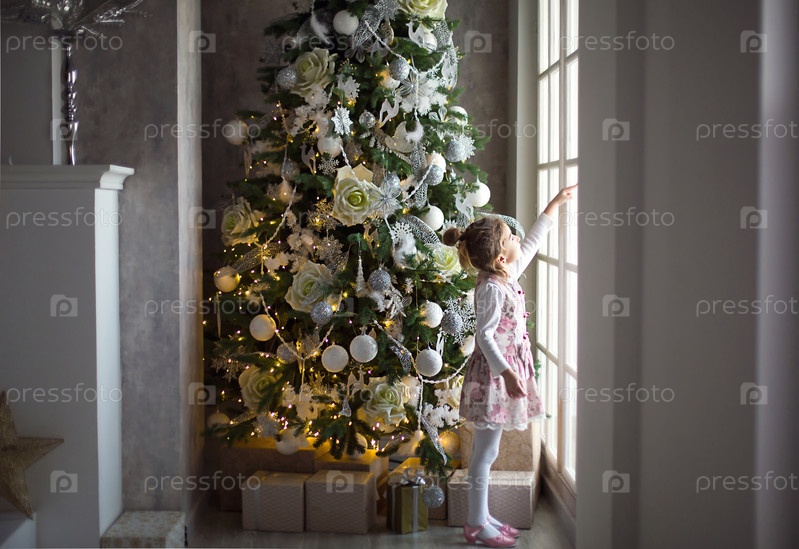 Маленькая девочка выглядывает из большого окна возле рождественской елки. В ожидании чуда, новогоднего белого декора в гостиной дома. Новый год, сказка и волшебство, детские мечты