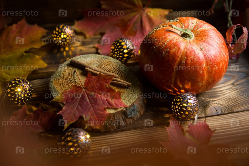 Оранжевая натуральная круглая тыква на деревянном столе с опавшими желтыми и красными кленовыми листьями, палочками корицы. Гирлянды огней, теплая осенняя атмосфера, День благодарения, праздник урожая, Хэллоуин. Копировать пространство