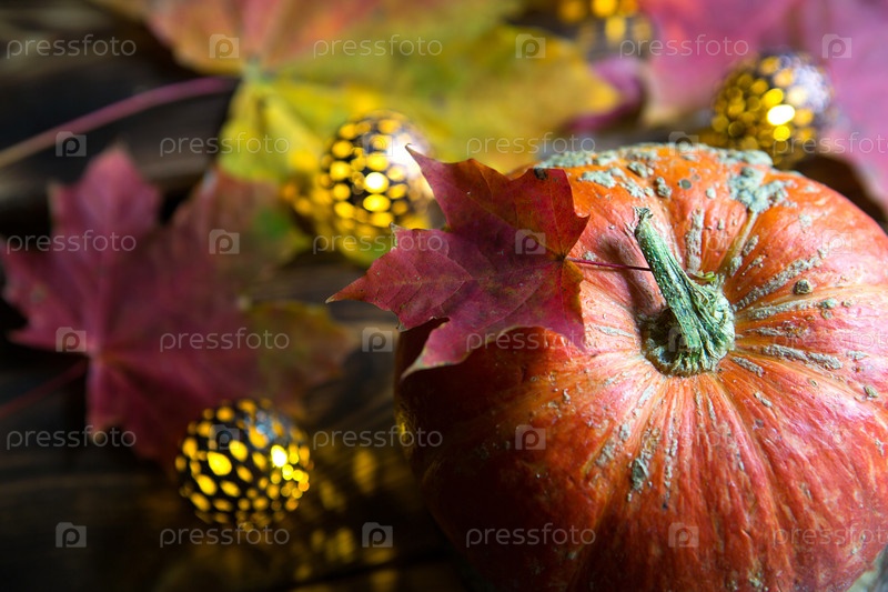 Оранжевая натуральная круглая тыква на деревянном столе с опавшими желтыми и красными кленовыми листьями, палочками корицы. Гирлянды огней, теплая осенняя атмосфера, День благодарения, праздник урожая, Хэллоуин. Копировать пространство