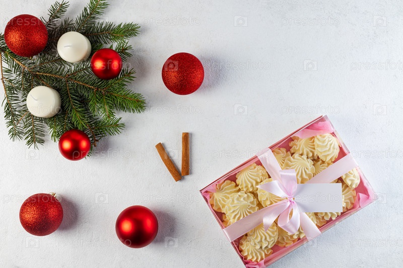 Красные елочные шары со свечами на светлом фоне. Выборочный фокус. Место для копирования. вид сверху