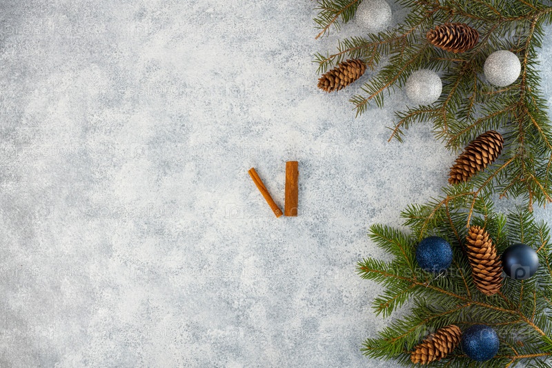 Елочные шары со свечами, с шишками на сером фоне. Выборочный фокус. Место для копирования. вид сверху. Рождество, новогодняя открытка