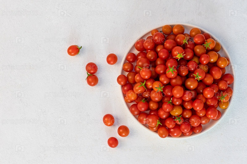 Красные помидоры черри в светлом блюде на светлом фоне, вегетарианский продукт, здоровая пища. копировать пространство