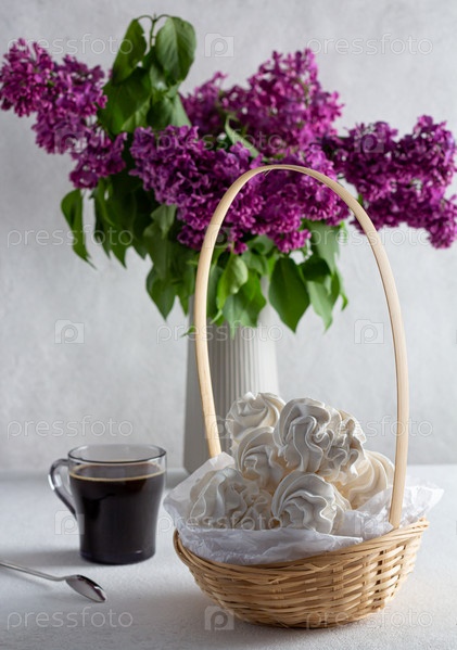 Яблочный зепфир на светлом фоне в тарелке, на заднем плане - чашка кофе, веточки сирени