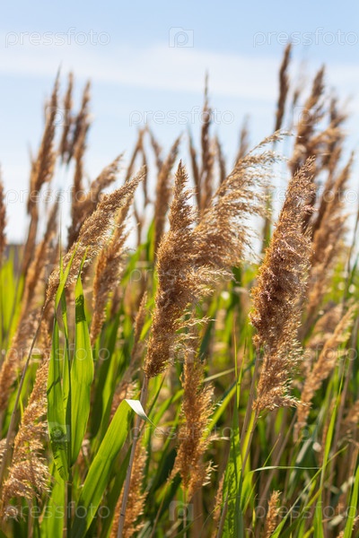 Сухой тростник на открытом воздухе в светлых пастельных тонах. Бежевый тростник, пампасная трава. Абстрактный естественный фон. Красивый узор в нейтральных тонах на фоне голубого неба