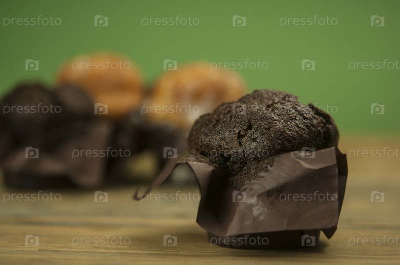 Домашние шоколадно-ванильные кексы на деревянном столе, посыпанные сахарной пудрой