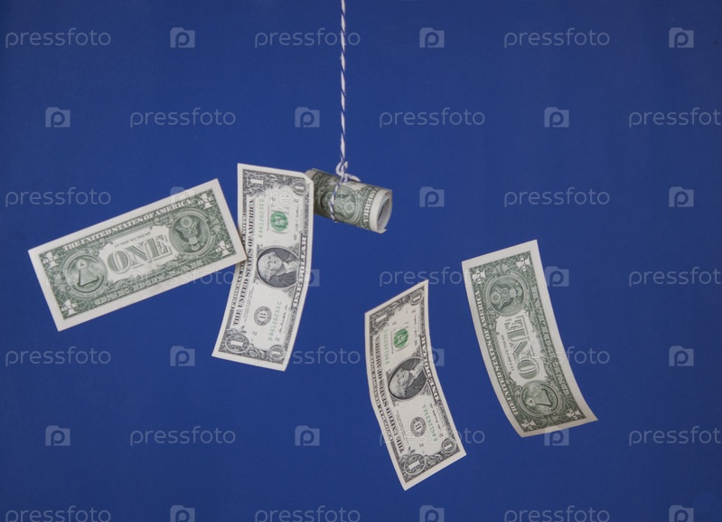 Набор летающих банкнот номиналом 1 доллар на синем фоне стены