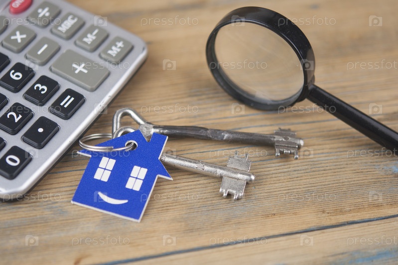 Оценка имущества. Миниатюрный дом с ключом, лупой и калькулятором. Концепция недвижимости