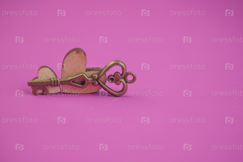 Розовый фон с двумя красными сердцами и ключом для поздравления с Днем святого Валентина