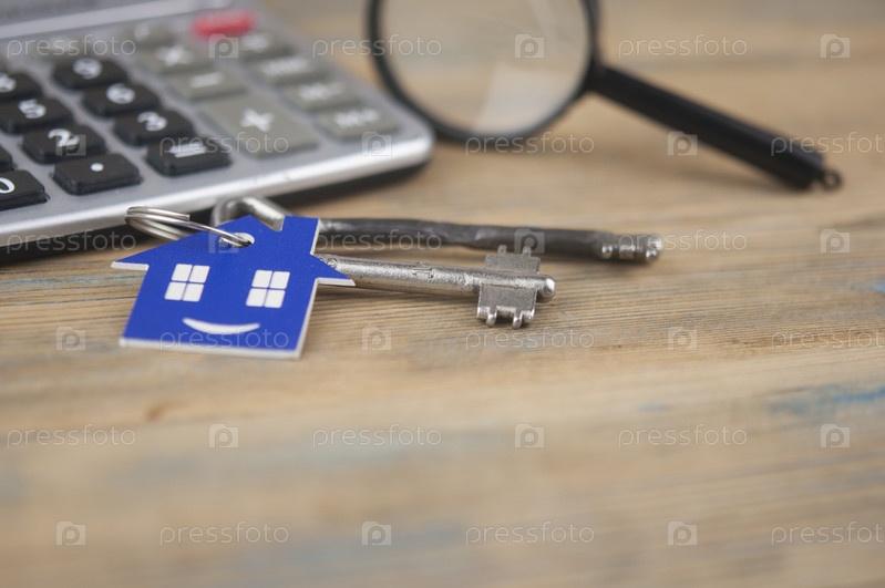 Оценка имущества. Миниатюрный дом с ключом, лупой и калькулятором. Концепция недвижимости