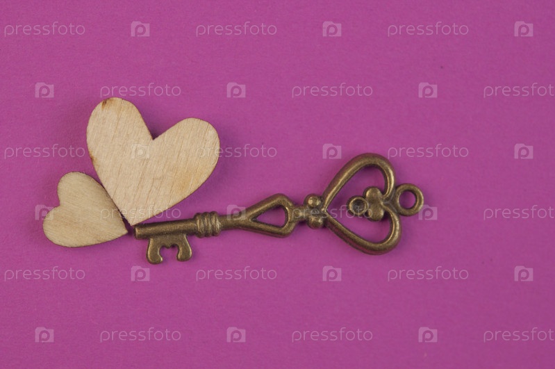 Розовый фон с двумя красными сердцами и ключом для поздравления с Днем святого Валентина