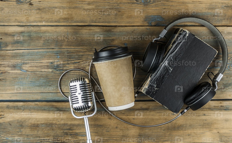 Старая книга с наушниками и чашкой кофе в одноразовом бумажном стаканчике на деревянном столе. Концепция дистанционного образования