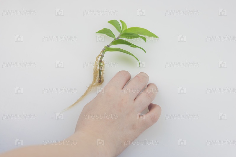 Детская рука показывает чистый корень розы комнатного растения, готовый к пересадке в горшок