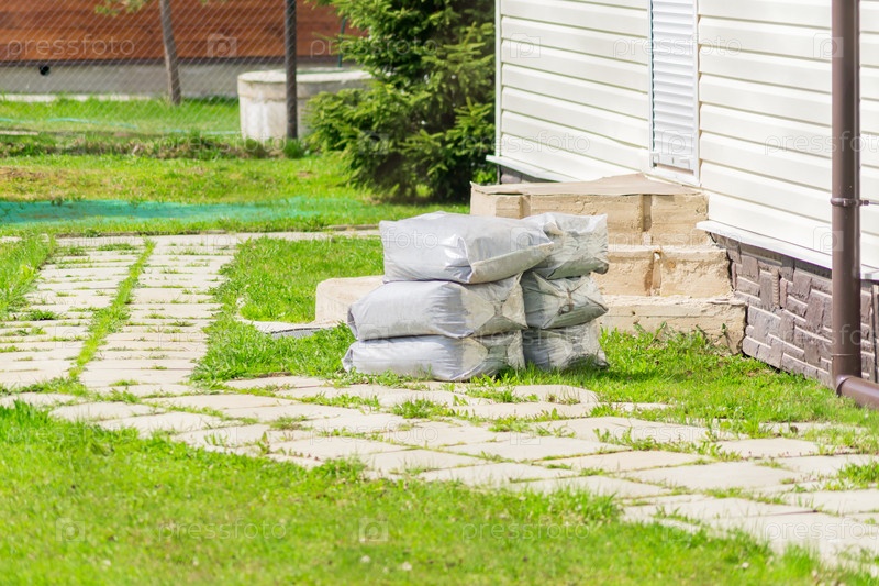 Мешки с землей на газоне перед домом